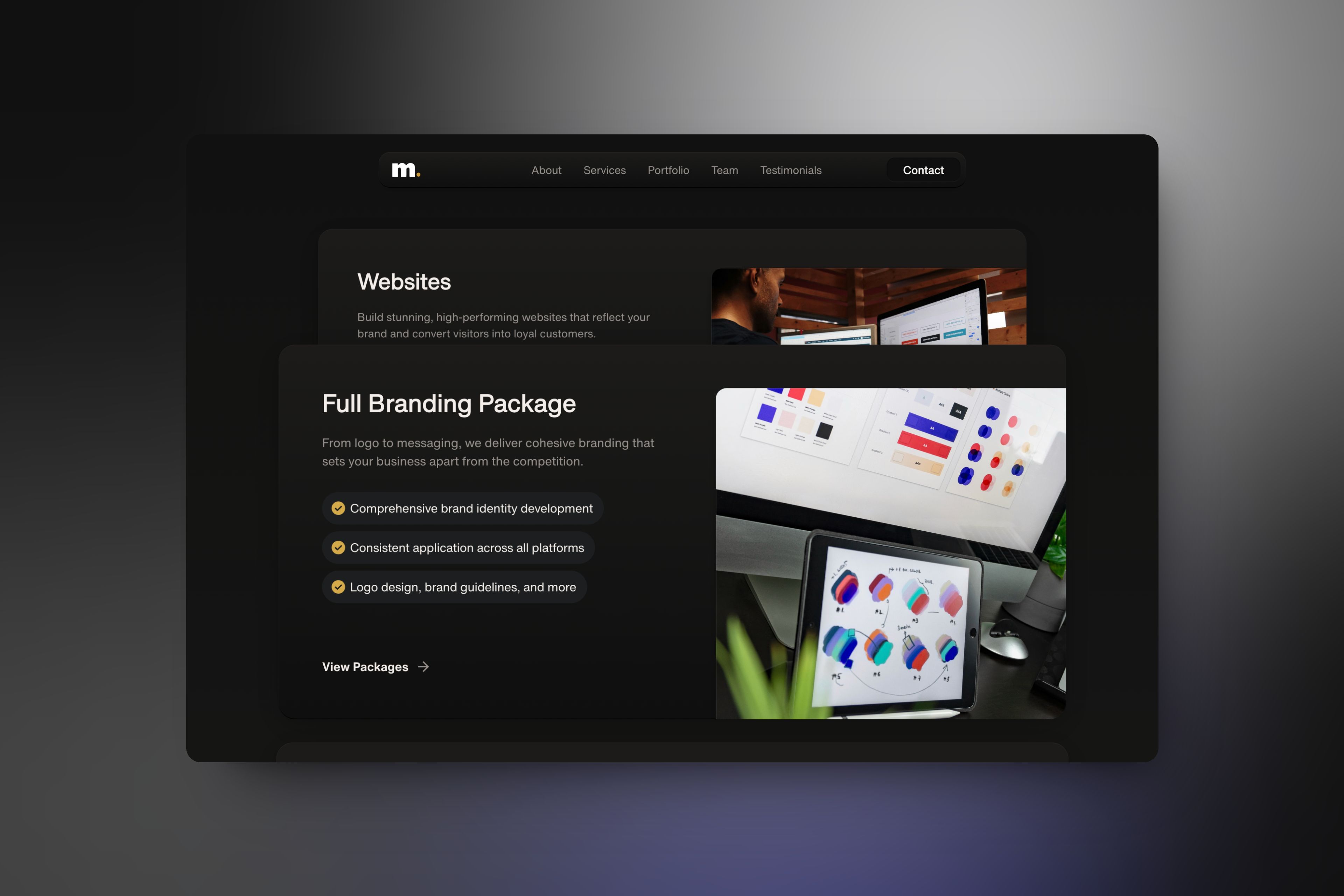 Fullscreen sticky cards for services and a video reel to engage visitors and encourage exploration.