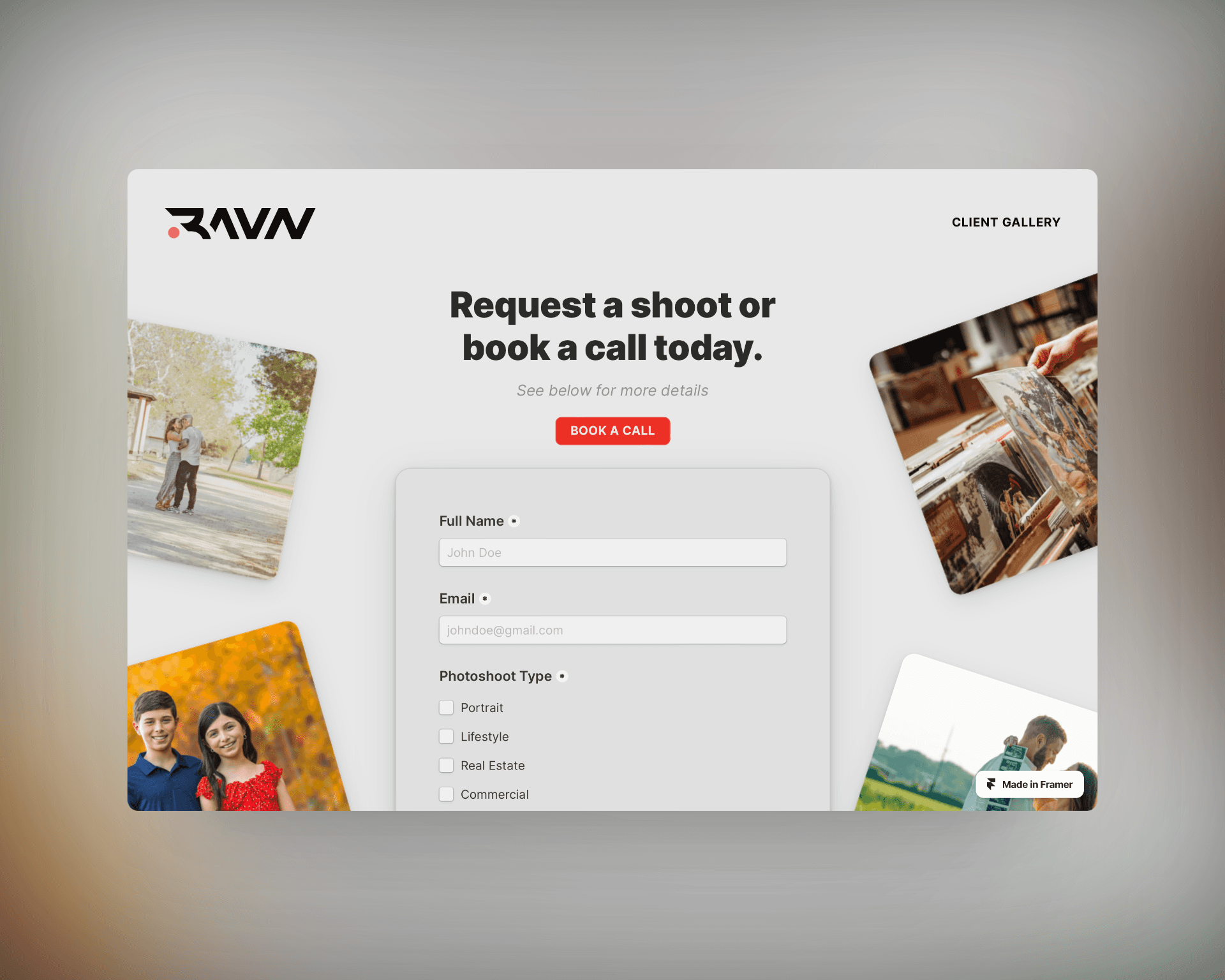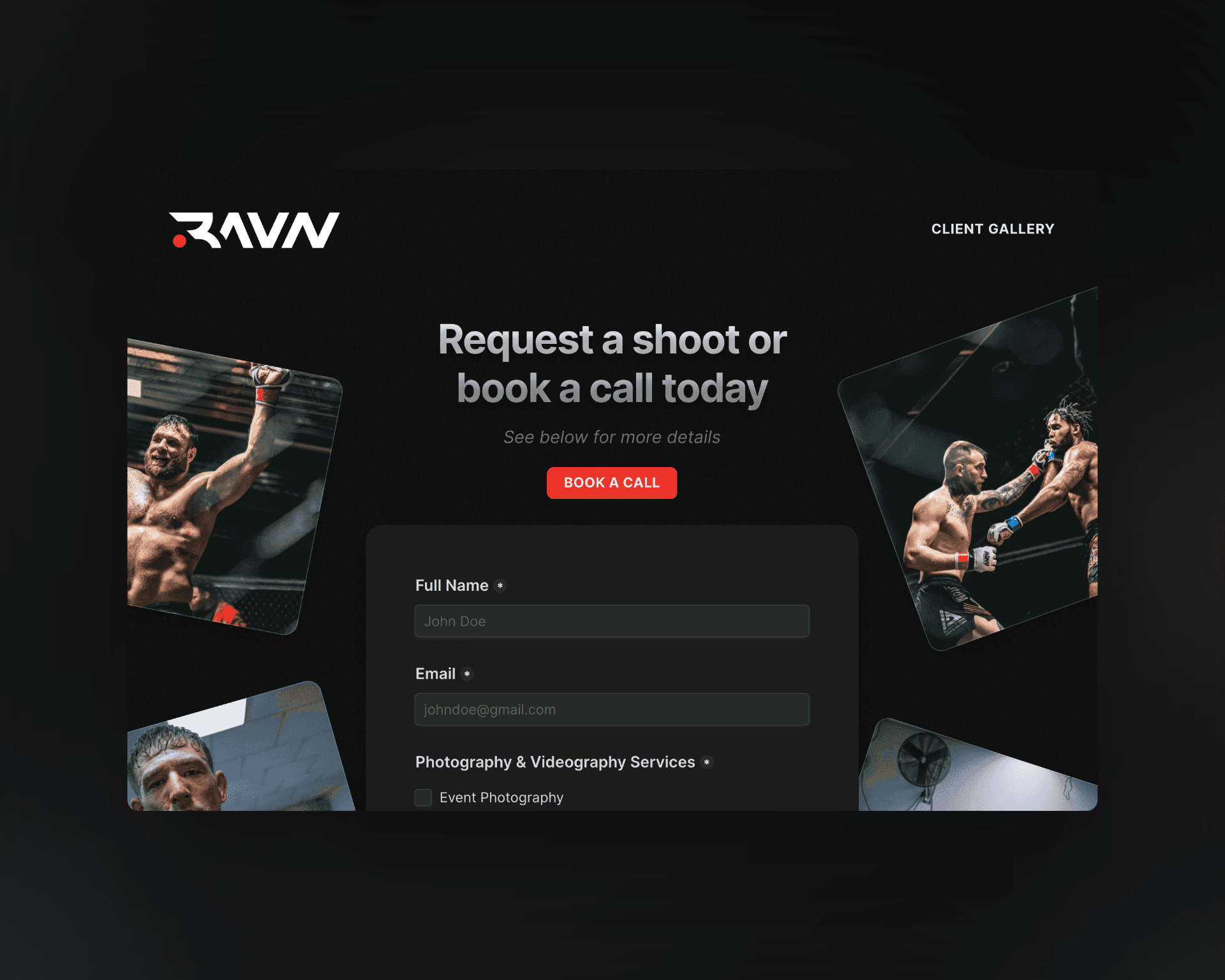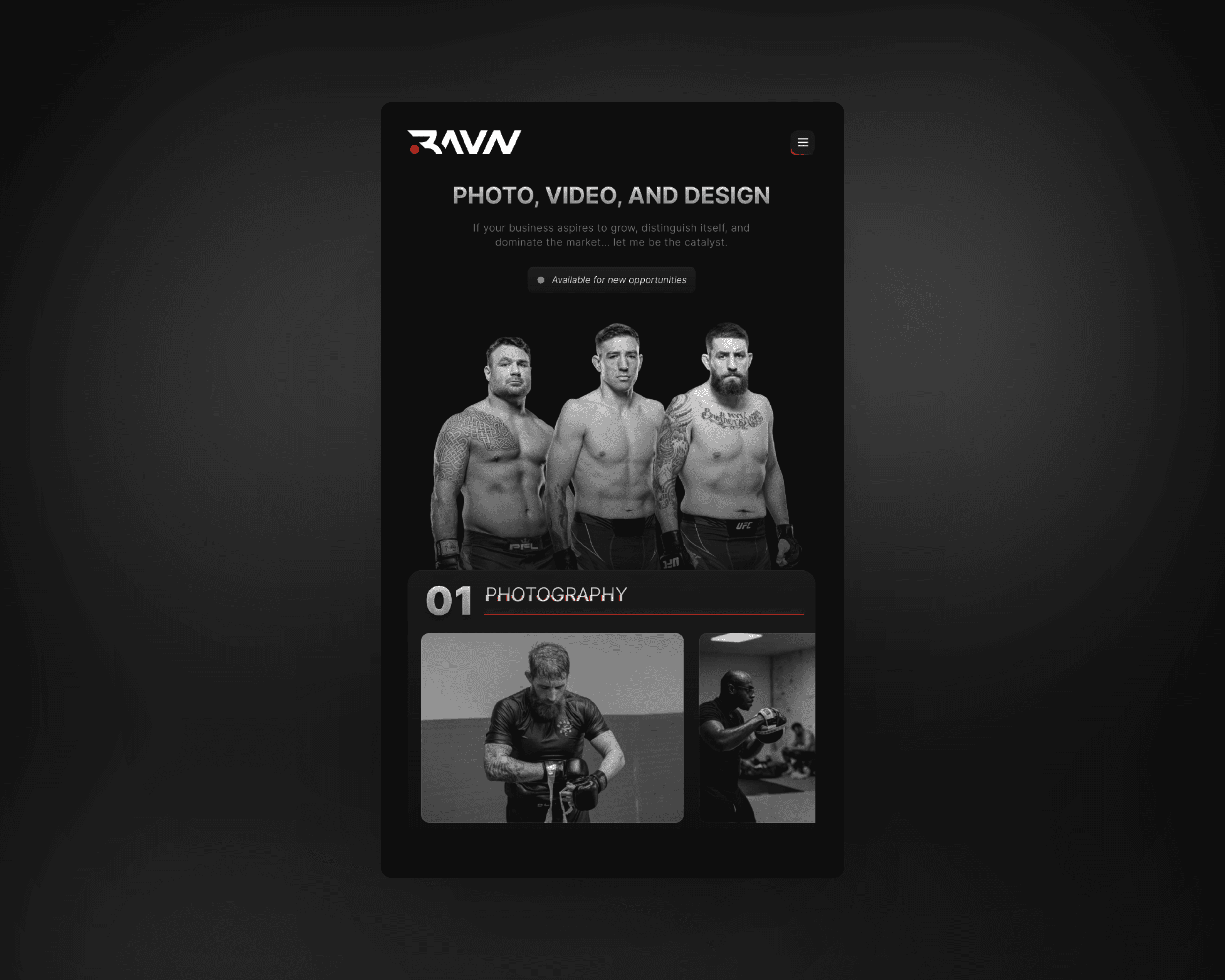UI/UX Design Designed for a cohesive look that aligns with RAVN Photos' brand and appeals to its diverse clientele.